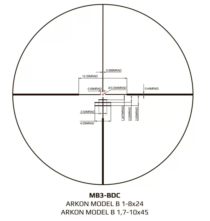Arkon Model B 1,7-10x45 оснащен барабанами ввода поправок закрытого типа с разметкой в MRAD. За один клик положение прицельной сетки сместится на 0,1 MRAD. Диапазон ввода поправок на дальность и ветер составляет 29,4 MIL.