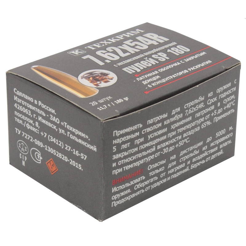 Патрон 7,62х54 SP 180 от «Техкрим» отличается тщательно выверенными техническими характеристиками. Масса пули составляет 11,7 грамм (180гран), что обеспечивает оптимальный баланс между настильностью траектории и передачей энергии. Стальная фосфатированная гильза гарантирует надежную экстракцию и стабильность при выстреле. Начальная скорость пули составляет 740 м/с, а кучность на дистанции 100 метров – всего 30 мм, что свидетельствует о высокой точности и стабильности данного патрона.